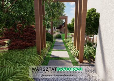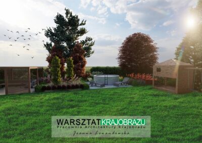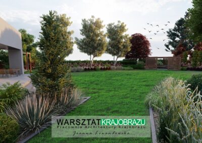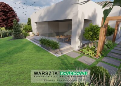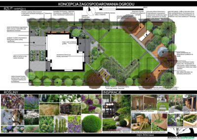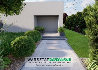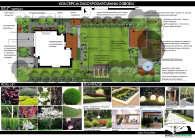 Nowoczesność, prostota i minimalizm, to główne wytyczne klientki. Roślinność w palecie barw zieleni, bieli i fioletu z akcentem bordo. Obie koncepcje o geometrycznym i prostym układzie z wydzielonymi wnętrzami na poszczególne strefy.