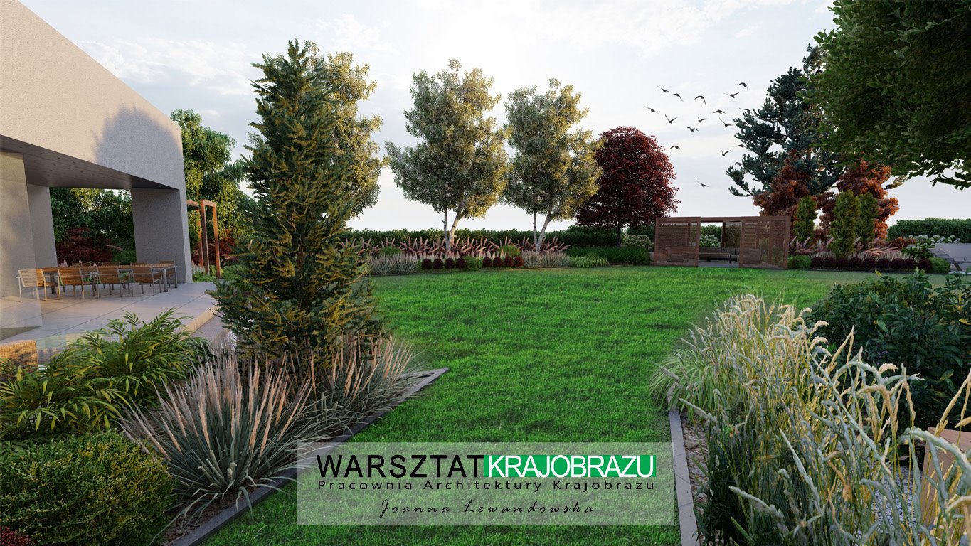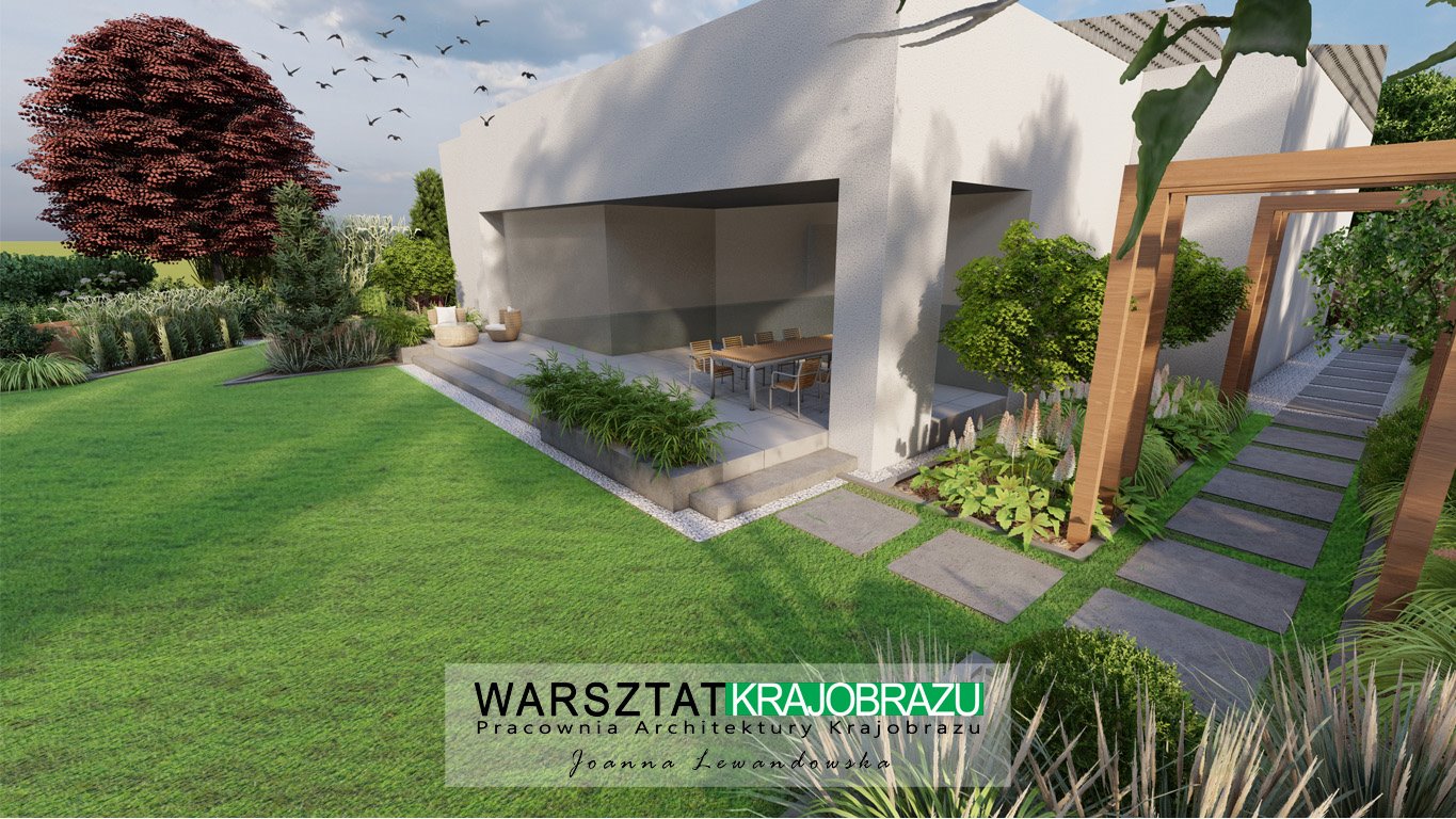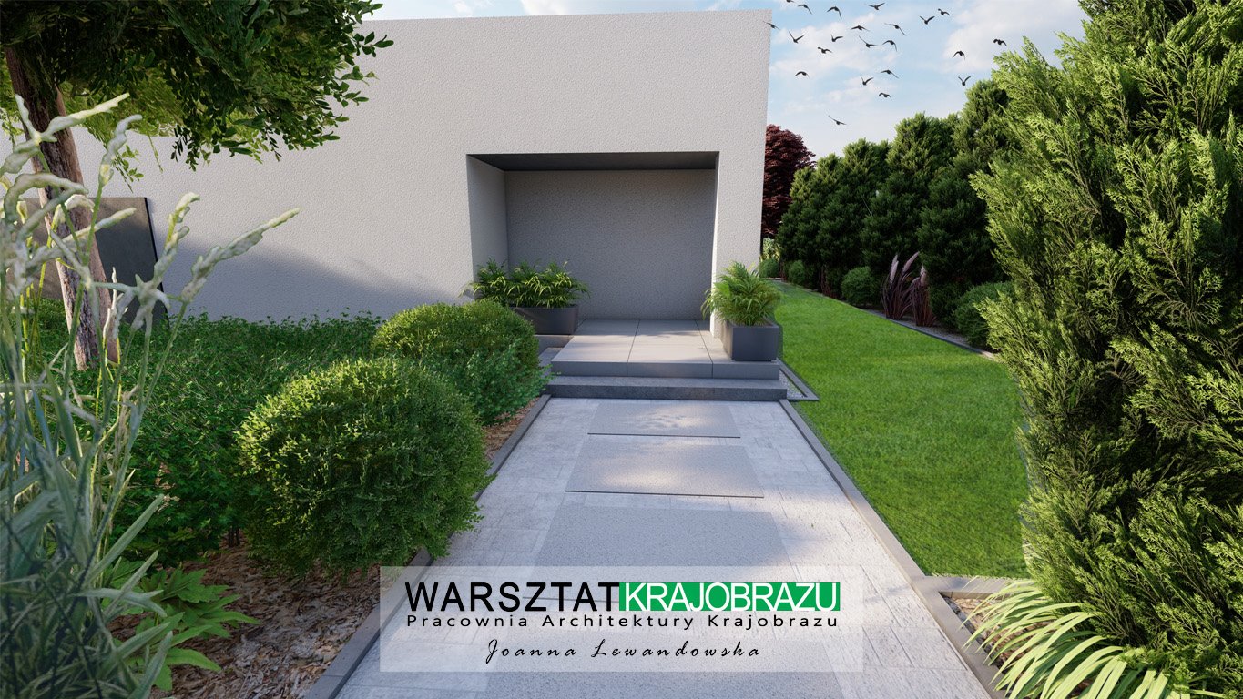 Nowoczesność, prostota i minimalizm, to główne wytyczne klientki. Roślinność w palecie barw zieleni, bieli i fioletu z akcentem bordo. Obie koncepcje o geometrycznym i prostym układzie z wydzielonymi wnętrzami na poszczególne strefy.