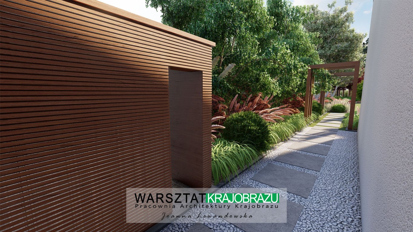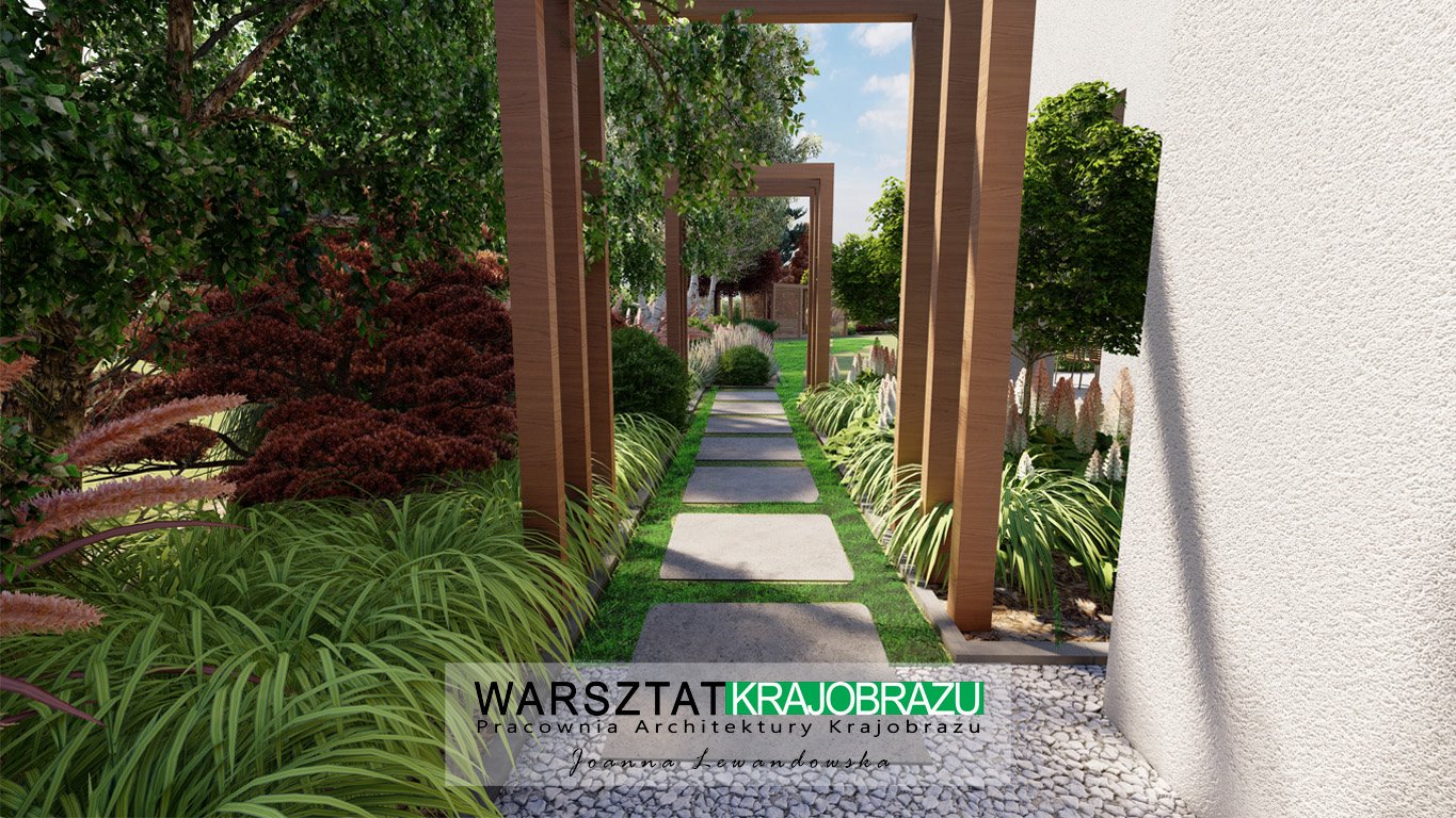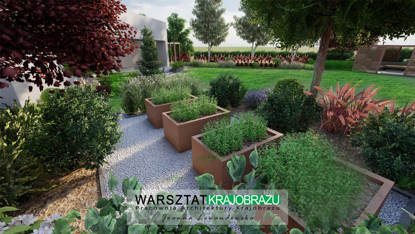 Nowoczesność, prostota i minimalizm, to główne wytyczne klientki. Roślinność w palecie barw zieleni, bieli i fioletu z akcentem bordo. Obie koncepcje o geometrycznym i prostym układzie z wydzielonymi wnętrzami na poszczególne strefy.